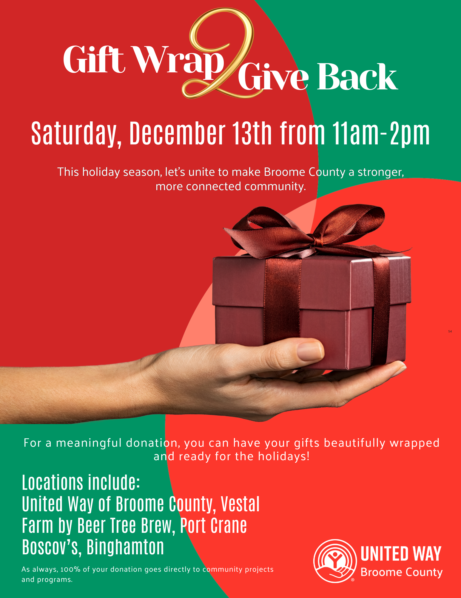 On Saturday, December 13th, 11am - 2pm, United Way of Broome County will be hosting a gift wrapping fundraiser! We are looking for volunteers to wrap gifts, help guests transport gifts in and out of the building, assist with serving refreshments and collect donations. Join us to spread some holiday cheer for a great cause!